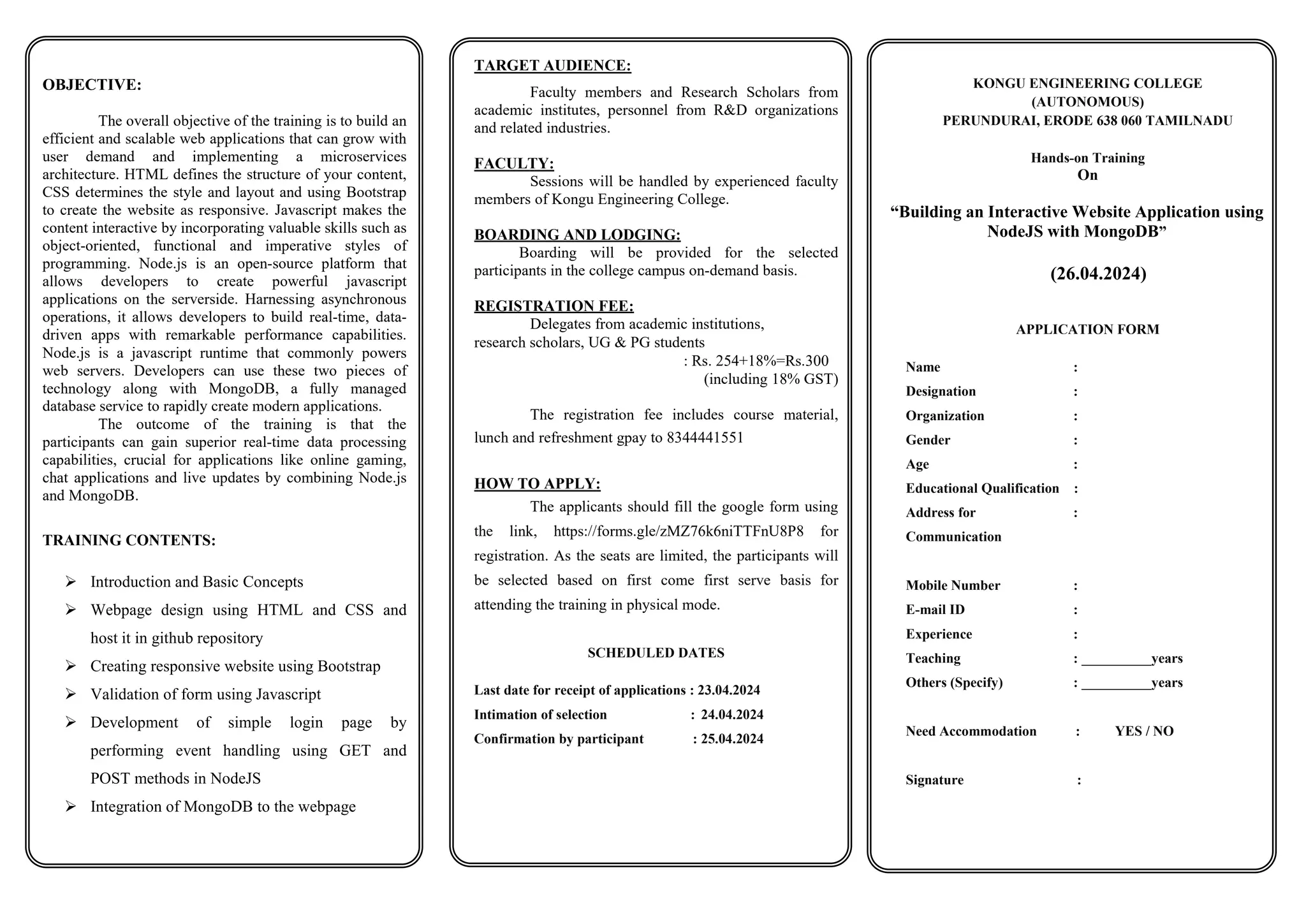 The document outlines a hands-on training program on building interactive website applications using Node.js and MongoDB, aimed at faculty members, research scholars, and industry personnel. It includes details about the training objectives, content, registration process, and scheduled dates, along with an application form and information about Kongu Engineering College. Participants will develop skills in web design, JavaScript, and real-time data processing, with sessions led by experienced faculty.