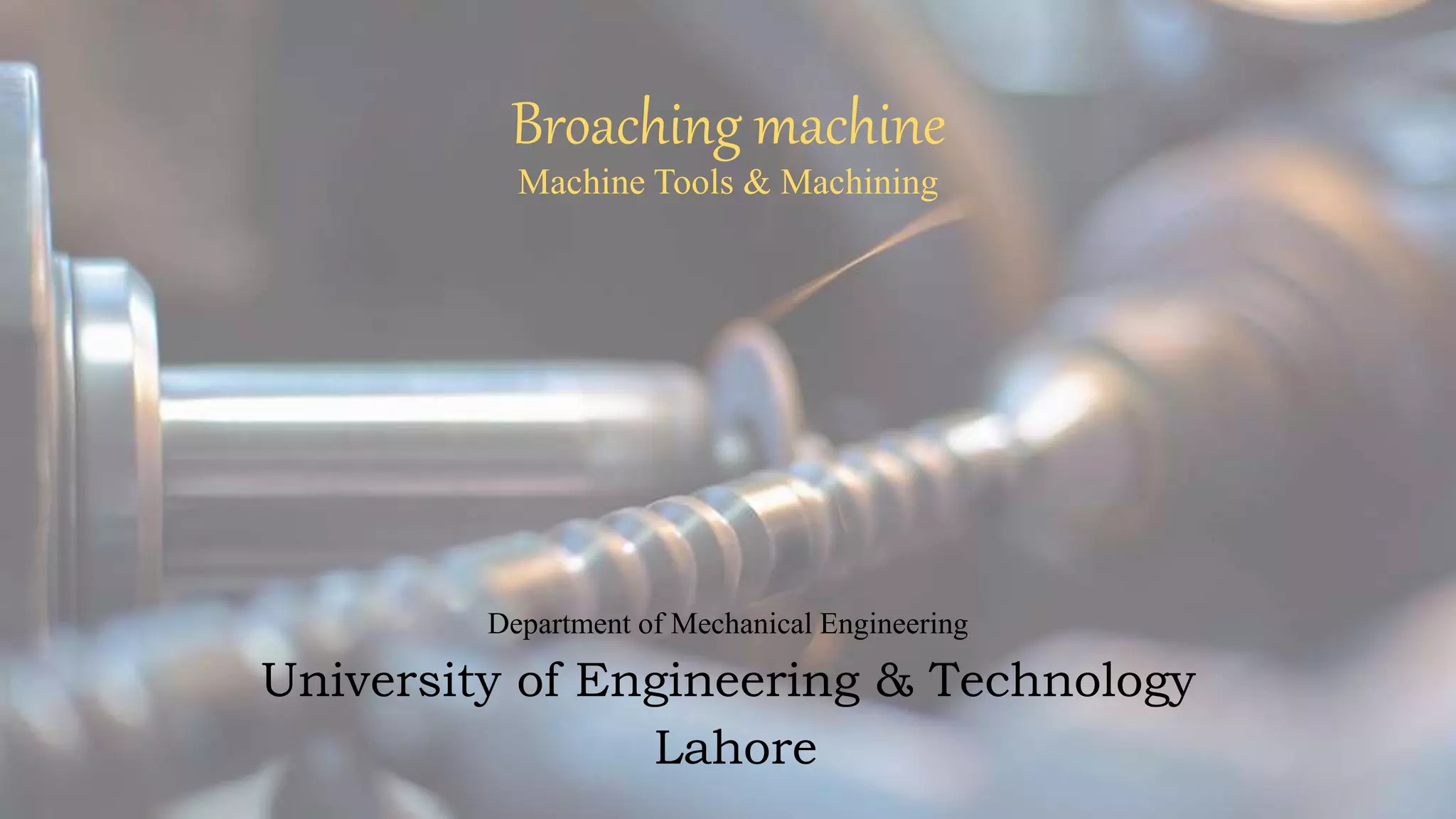 The document discusses broaching machines and the broaching process. Broaching involves using a broach tool with multiple cutting teeth to machine internal or external surfaces. Broaching machines include horizontal, vertical pull, continuous, and rotary table types. Broaching produces parts with good dimensional accuracy and surface finish. It is commonly used to cut keyways, splines, and other features on mechanical components.