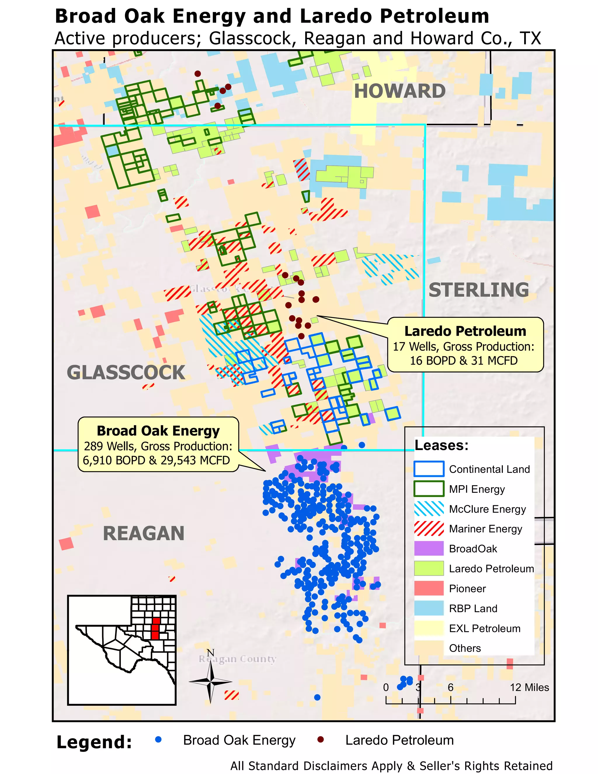 Broad Oak Energy and Laredo Petroleum are active producers in Glasscock, Reagan, and Howard Counties in Texas. Broad Oak Energy operates 289 wells across the three counties, producing over 6,900 barrels of oil per day and 29,500 thousand cubic feet of natural gas per day. Laredo Petroleum operates 17 wells in the area, producing around 16 barrels of oil per day and 31 thousand cubic feet of natural gas per day. The leases for Laredo Petroleum are held by various operators including Continental Land, MPI Energy, McClure Energy, and Mariner Energy.