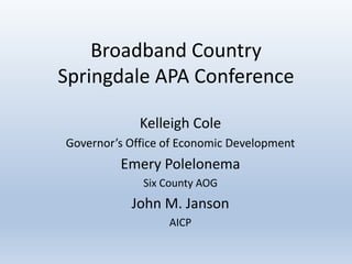 2) It explores how broadband impacts various sectors like education, economic development, healthcare, and more. It also summarizes the goals and efforts of the Utah Broadband Project and regional broadband planning councils.