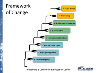 The Broadband Boot Camp 2015 in Baraboo, WI aimed to enhance broadband access and e-commerce through education, focusing on creating urgency, building teams, and developing strategic visions. It highlighted the importance of broadband for economic development, healthcare, and community engagement, featuring various presentations on internet safety, telecommuting, and broadband benefits. The event fostered collaboration among stakeholders to improve internet service and infrastructure across several counties.