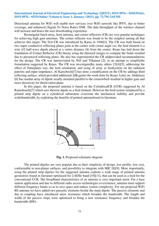This document describes a novel broadband cylindrical corner reflector antenna for 2.4GHz WiFi base station applications. The antenna uses a printed strip dipole fed cylindrical corner reflector to provide high directivity of 12dBi and impedance bandwidth of 310MHz. Two parasitic elements were added to broaden the bandwidth to cover 1.25GHz, maintaining consistent radiation patterns across frequency bands. Simulation and experimental results showed good agreement, validating the antenna's ability to support various wireless communication standards with a simple design.