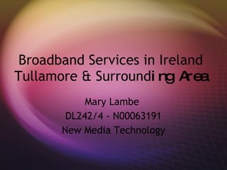 The document discusses broadband internet services available in the Tullamore, Ireland area. It provides information on different broadband technologies like DSL, cable, and satellite as well as providers in the region such as BT, Eircom, Imagine, Digiweb, and Perlico. Based on needing reliable internet for an event management business, BT broadband is selected as the best option due to its reasonable price and sufficient connection speed. If located in Sydney, Australia, Telstra broadband would be the best choice for its unlimited usage package and coverage as the leading telecom provider in the country.