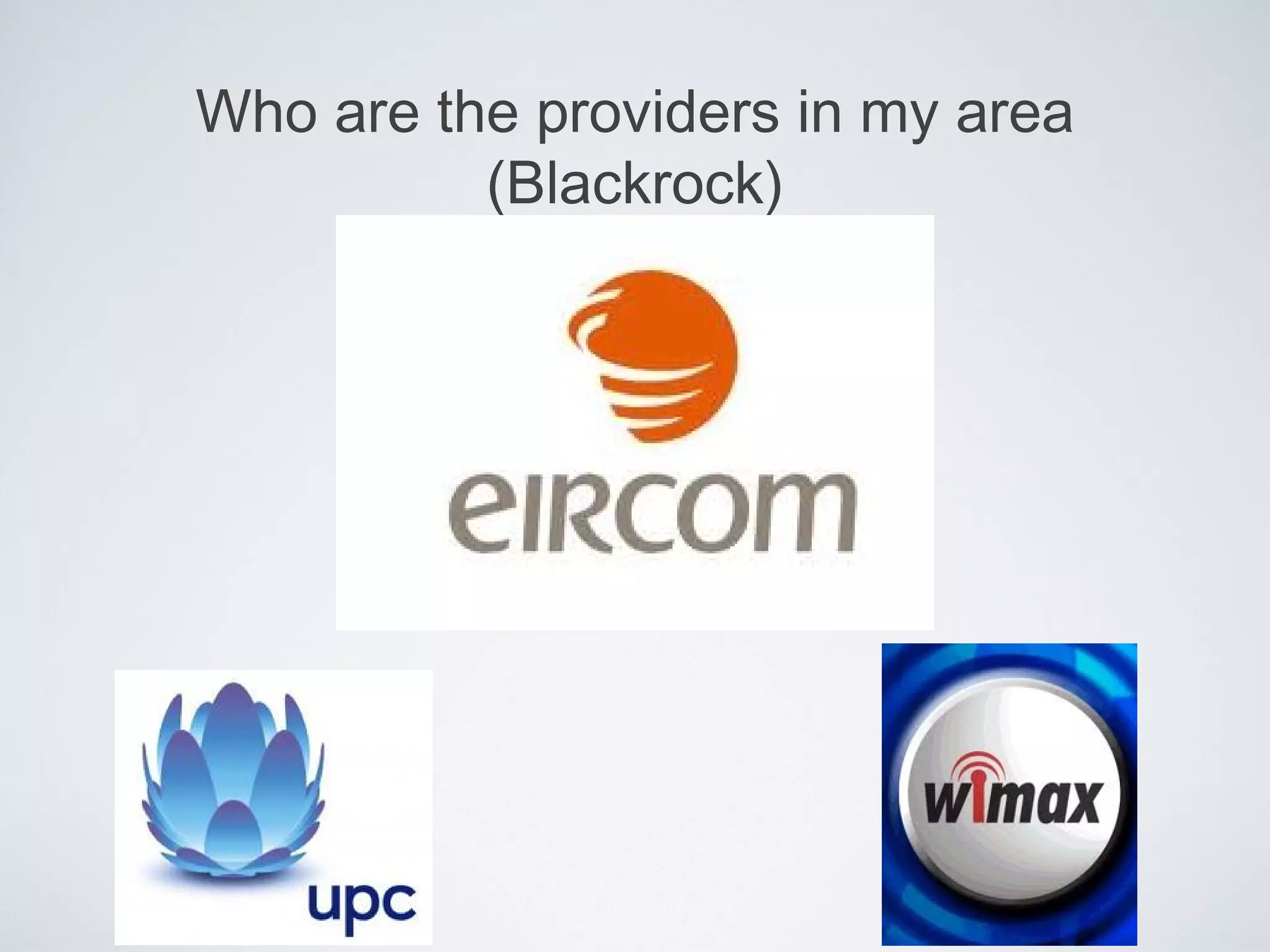 The document discusses broadband internet options available in the Blackrock area. It describes the main types of broadband technologies as DSL, cable modem, fiber, and wireless. The major providers in the area are Eircom and UPC. Eircom provides broadband via fiber optic cables while UPC uses coaxial cables. A newer option is WiMax, which provides broadband via 4G wireless technology without line rental fees. The document outlines the speed and data options available from each provider, with prices ranging from €39-€65 per month. It determines that UPC would best suit the needs as it offers both broadband and phone services at competitive prices and speeds.