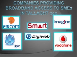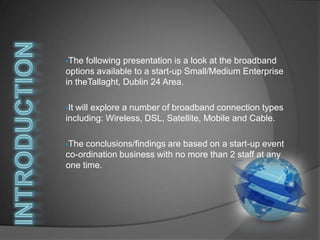 The document presents an overview of broadband options for start-up enterprises in Tallaght, Dublin, discussing connection types like wireless, DSL, satellite, mobile, and cable. It includes definitions of relevant terms, internet service providers, and pricing details for various broadband packages. The findings are tailored for small businesses, highlighting factors such as speed, connection methods, and service providers operating in Ireland.