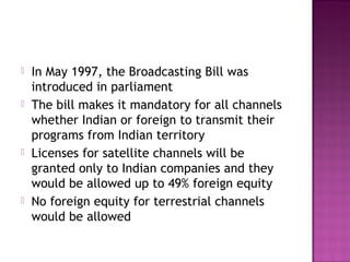 The Broadcasting Bill of 1997 mandates that all channels operate from Indian territory and limits foreign ownership to 49% for satellite channels and none for terrestrial ones. It aims to establish an independent Broadcasting Regulatory Authority of India to oversee licensing and content regulation, while addressing issues of media monopolization and ensuring diverse programming. The bill, however, has faced criticism for potential government overreach in controlling media content, especially highlighted after the Mumbai attacks.