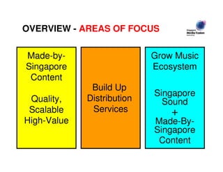 The presentation outlines the Media Development Authority of Singapore's initiatives and achievements in broadcast and music as of 2008, highlighting local production successes and international collaborations. It details goals for 2009, which include increasing local content production, innovative public service programming, and developing the music industry in Singapore through new business models and partnerships. The document emphasizes expanding Singapore's role as a media hub and enhancing local and international content distribution.