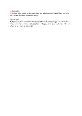 Terrestrial radio broadcasts include music, speech, drama, and commercial programming sent from stations either live or recorded for public listening. Recorded radio allows audiences to replay or download audiovisual content. Live radio has no delay and includes talk formats like call-in shows. Digital technologies now enable broadcasting of high quality digital audio and distribution of podcasts and internal radio streams over the internet.