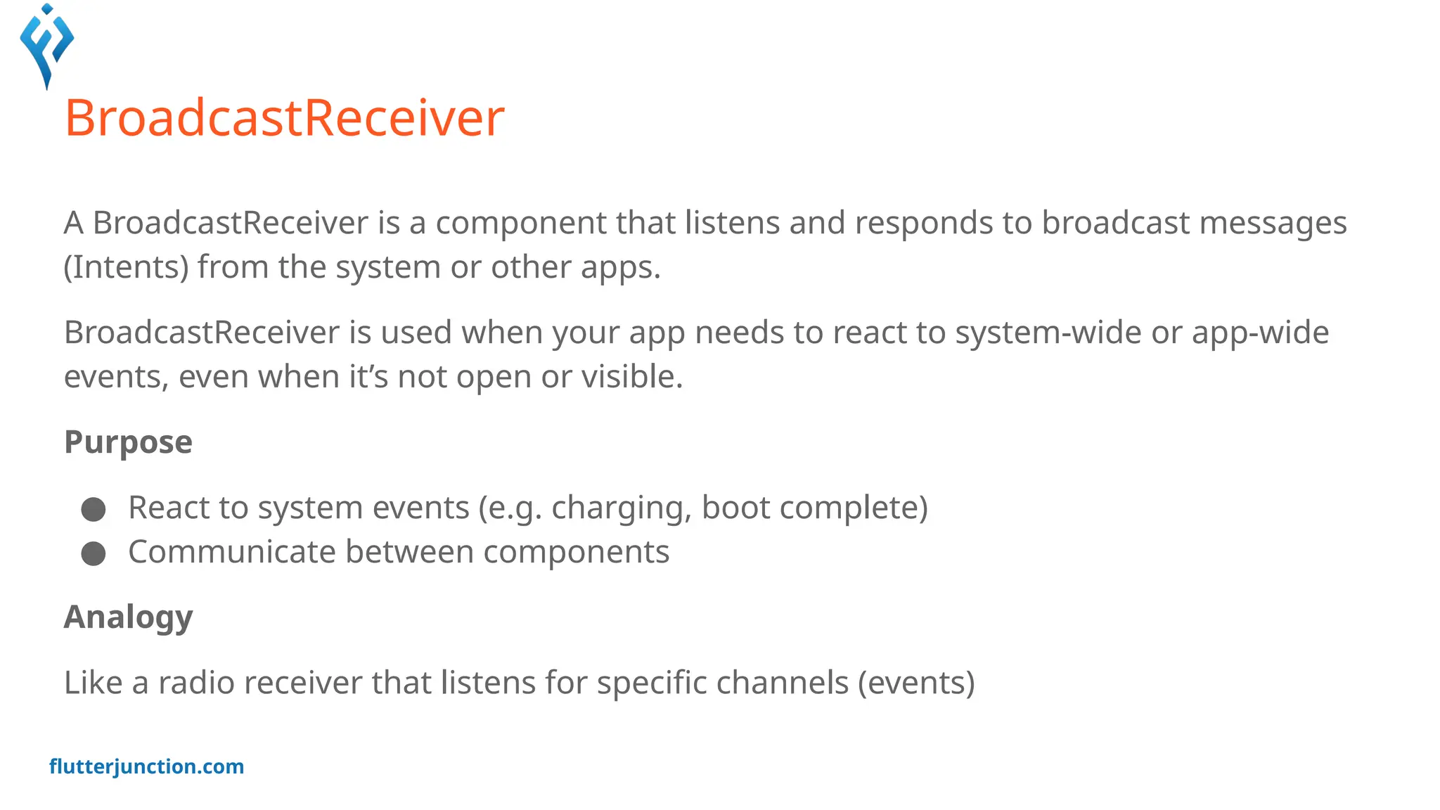 The BroadcastReceiver class enables apps to respond to these events even if the app is not currently running in the foreground. Developers can register receivers either statically in the AndroidManifest.xml or dynamically in code using Context.registerReceiver().
