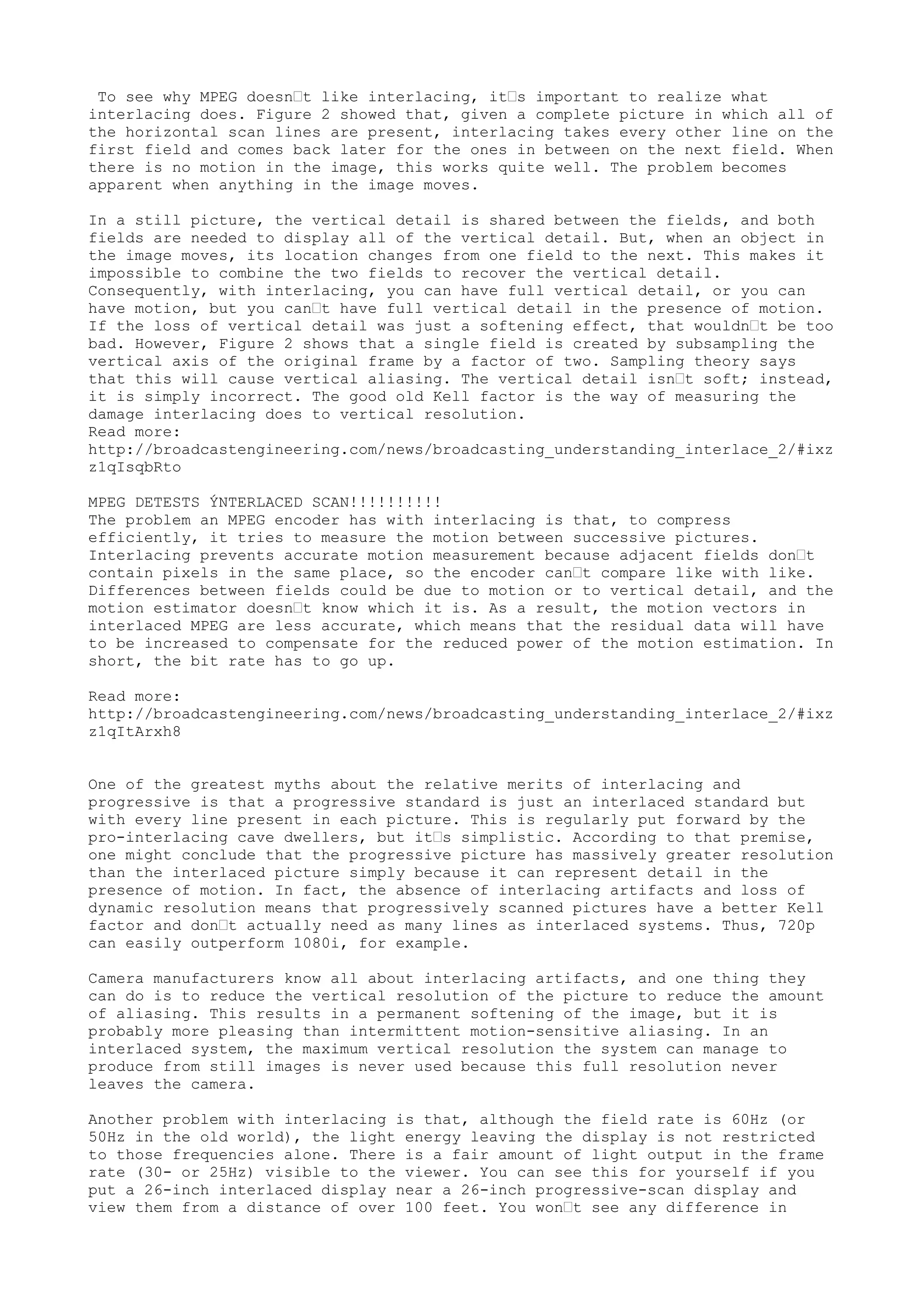 The document discusses several technical issues that arise with interlaced video formats compared to progressive formats. It explains that with interlacing, full vertical detail or motion can be achieved but not both, and that this causes problems for video compression algorithms. It also notes that while progressive formats avoid these interlacing artifacts, moving objects may appear flickering. Overall, the document analyzes various technical tradeoffs between interlaced and progressive video.