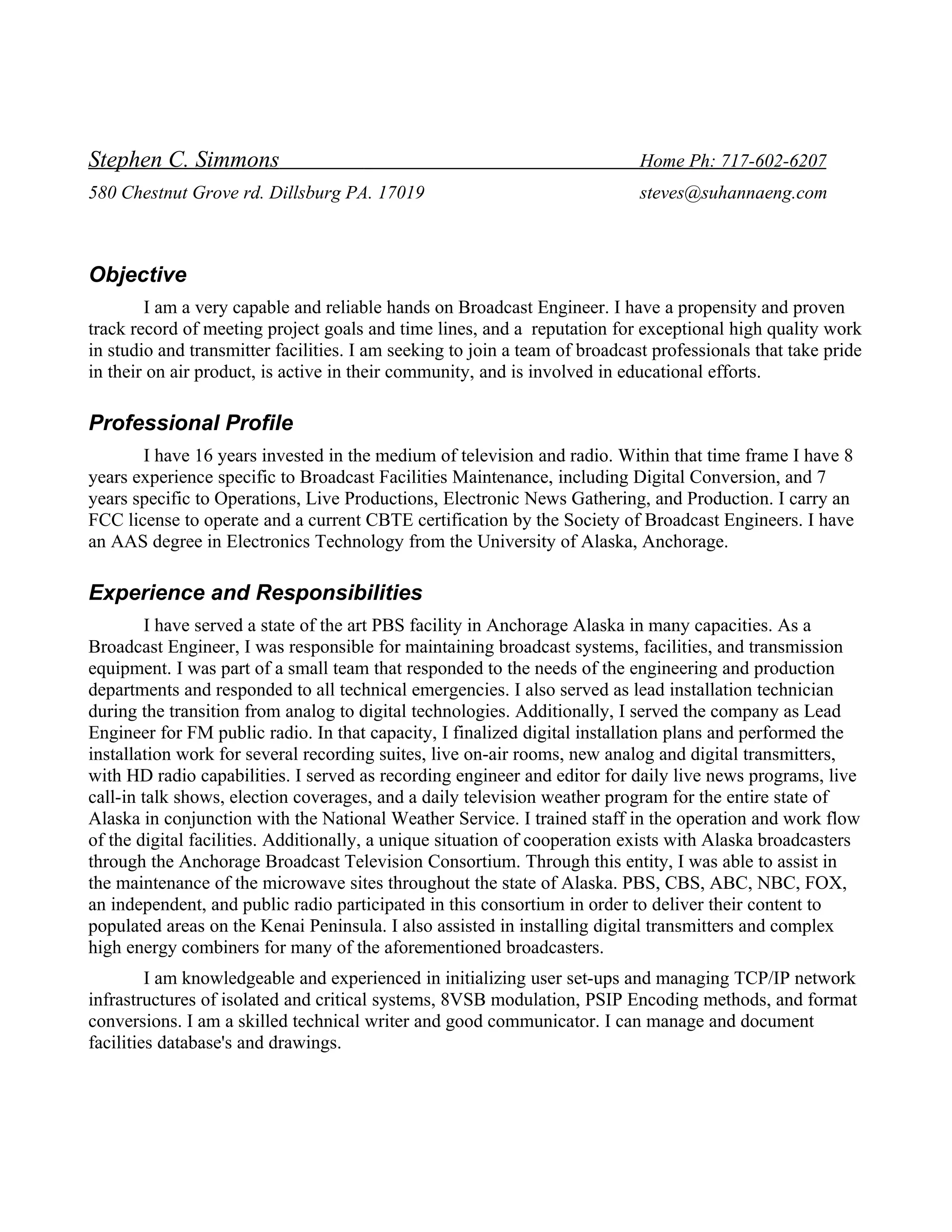 Stephen Simmons is a broadcast engineer with 16 years of experience in television and radio engineering, operations, and production. He has expertise in digital conversion, facilities maintenance, live productions, and electronic news gathering. He is seeking a position with a community-focused broadcast organization where he can utilize his skills in engineering, operations, and training staff.