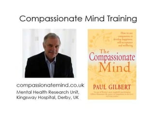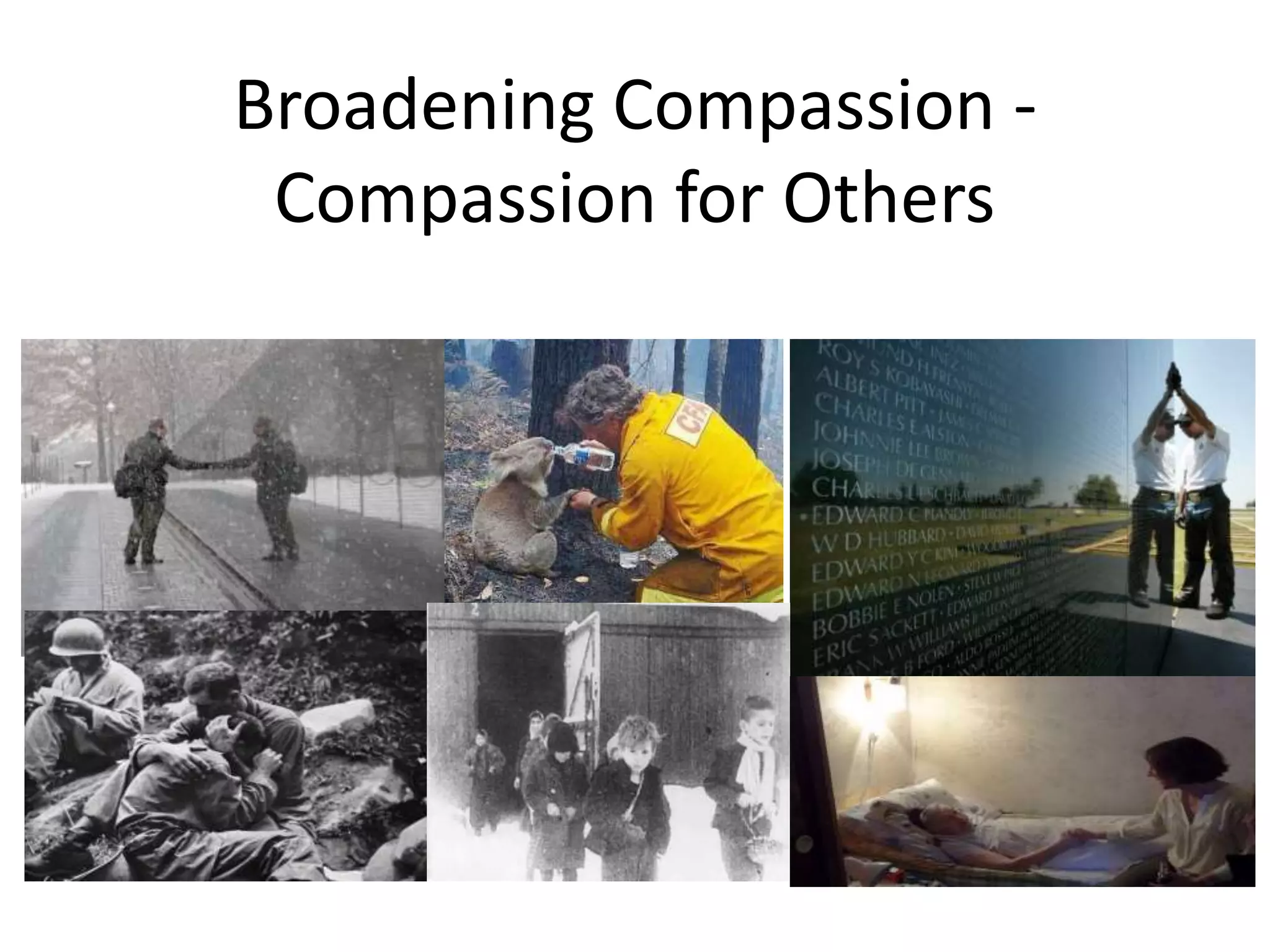 This document discusses broadening compassion for others. It discusses that compassion is rooted in the attachment system and can help open up emotional memories that were closed off due to abuse and neglect. It also notes that people may actively resist engaging in compassion due to various fears, and that meditating on compassion can bring up feelings of grief, wanting, and loneliness in those with strong inner self-criticism. The document encourages identifying personal fears of compassion for others and barriers to extending compassion using a compassion scale.