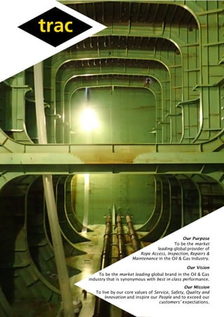TRAC Oil & Gas is a leading global provider of rope access inspection, repair, and maintenance services for the oil and gas industry. Their vision is to be the leading brand in the industry known for best-in-class performance. Their mission is to uphold their core values of service, safety, quality, and innovation to inspire their people and exceed customer expectations. They offer a comprehensive range of engineering support, inspection, and maintenance services throughout the asset lifecycle.