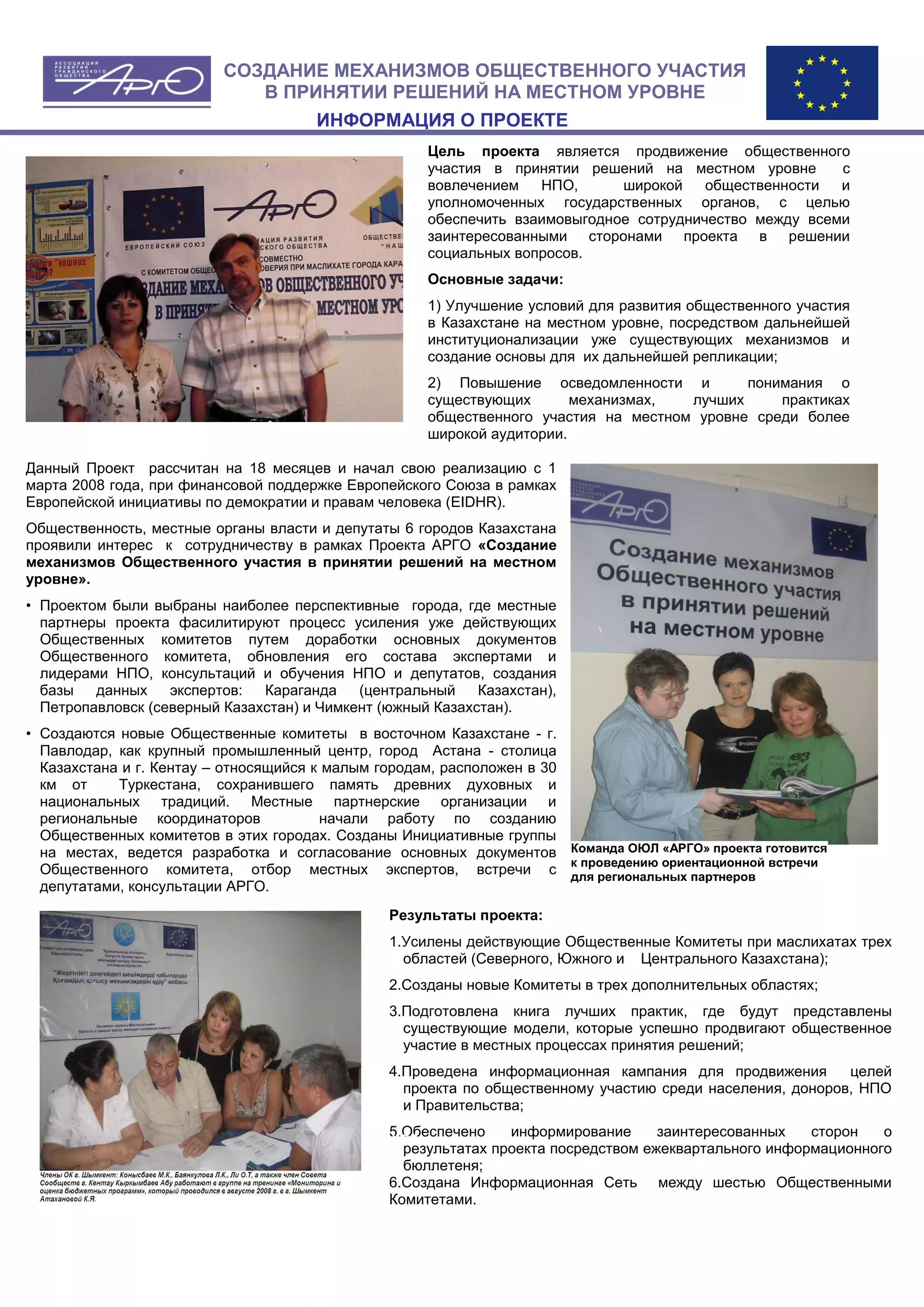 Проект нацелен на развитие механизмов общественного участия в принятии решений на местном уровне в Казахстане с целью улучшения сотрудничества между НПО, общественностью и государственными органами. В рамках проекта планируется усиление существующих общественных комитетов, создание новых, подготовка книги лучших практик и проведение информационных кампаний для повышения осведомленности. Проект реализуется в шести городах страны и поддерживается Европейским Союзом.