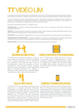 TT Videolim è una piattaforma innovativa di videoconferenza e e-learning che utilizza lavagne interattive multimediali e sistemi di videoconferenza per facilitare la comunicazione e la collaborazione tra aziende, scuole ed enti formativi. Offre supporto completo ai clienti, dalla consulenza all'assistenza post-vendita, e consente una personalizzazione dei servizi in base alle esigenze specifiche. La piattaforma permette di gestire meeting, lezioni online e condivisione di contenuti in modo intuitivo e interattivo, migliorando l'efficacia della formazione a distanza.