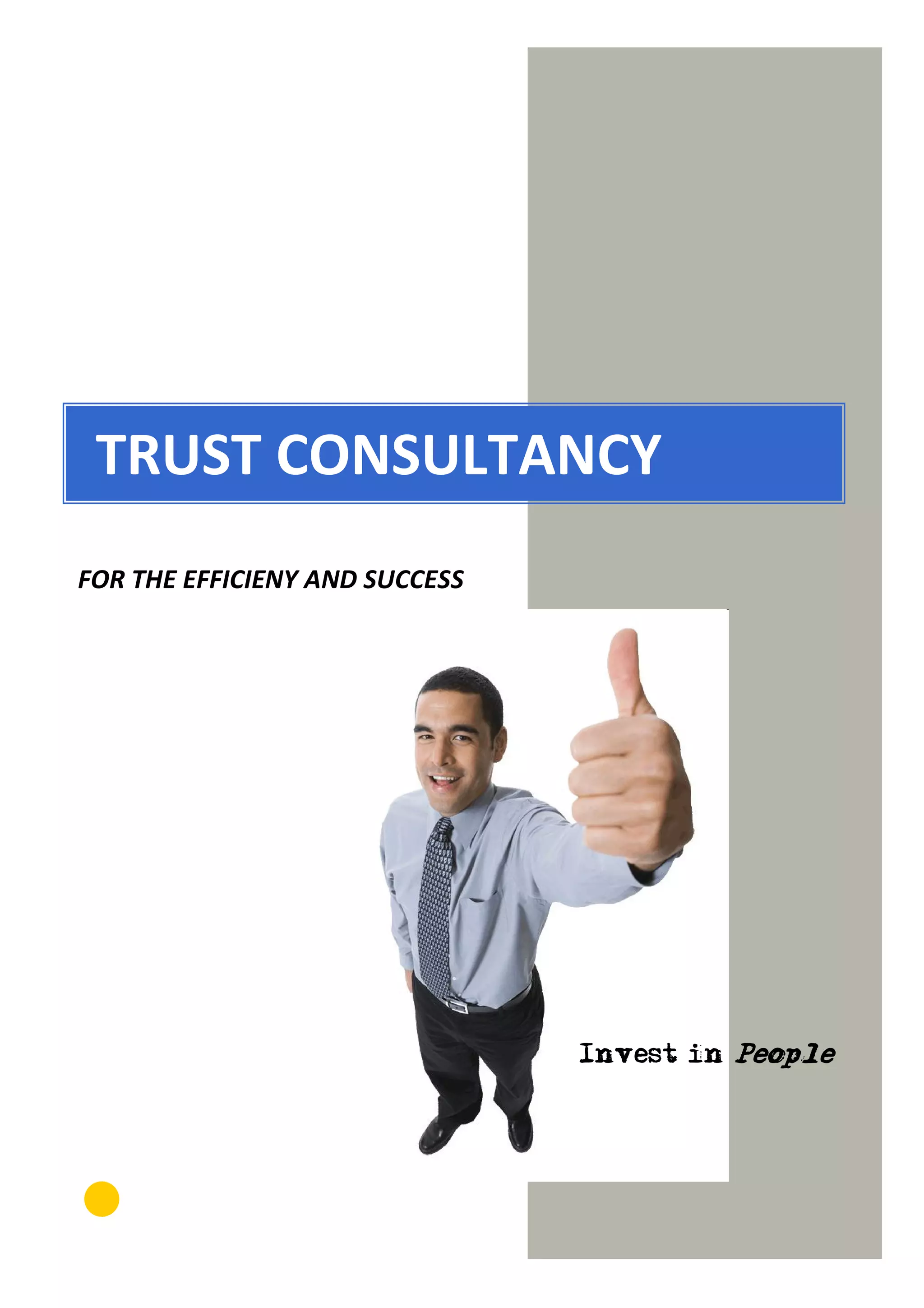 Trust Consultancy provides professional services to SMB and MMB companies through their team of experts. Their services include human resources consulting, enterprise consulting, training, and other services such as financial and investment consulting. Their goal is to serve as a trustworthy business partner and direct the right services and people to help customers increase efficiency and performance.