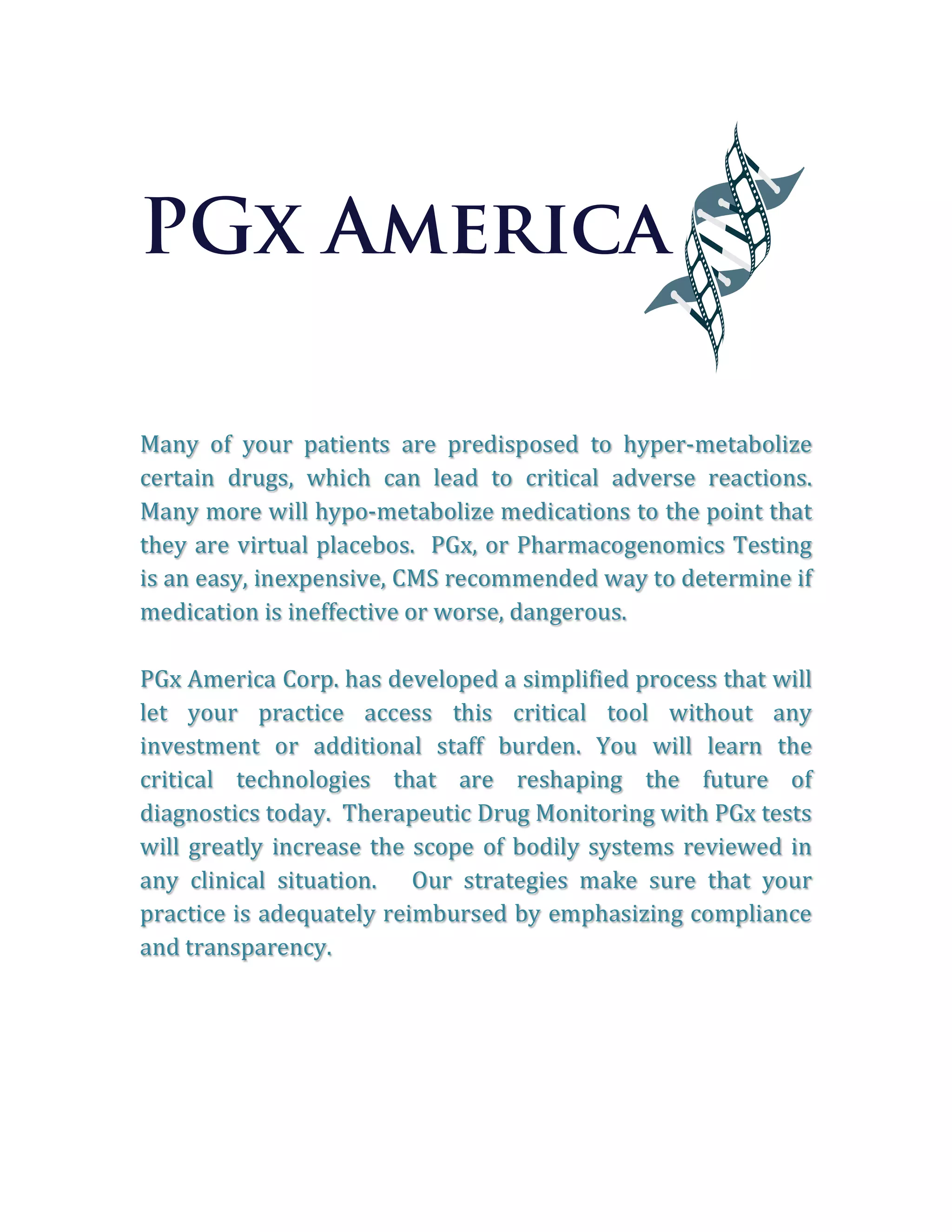 This document discusses how pharmacogenomic (PGx) testing can help medical practices safely and effectively treat patients by determining if medications will be ineffective or dangerous for a patient based on their genetic profile. It provides steps on how the nurse, doctor, and biller should handle PGx testing for eligible patients, which can increase reimbursement for the practice. PGx America offers a simplified process for practices to access this diagnostic tool without investment or additional staff workload, and will provide test results and support to help practitioners incorporate this technology.
