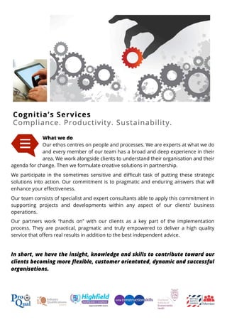 Cognitia provides compliance, training, and human resources consulting services and solutions. They help organizations maximize potential and meet targets. Services include health and safety compliance, NVQ training programs, ISO consultancy, and staff recruitment. Cognitia aims to add value for clients through successful outcomes and sustainable change.