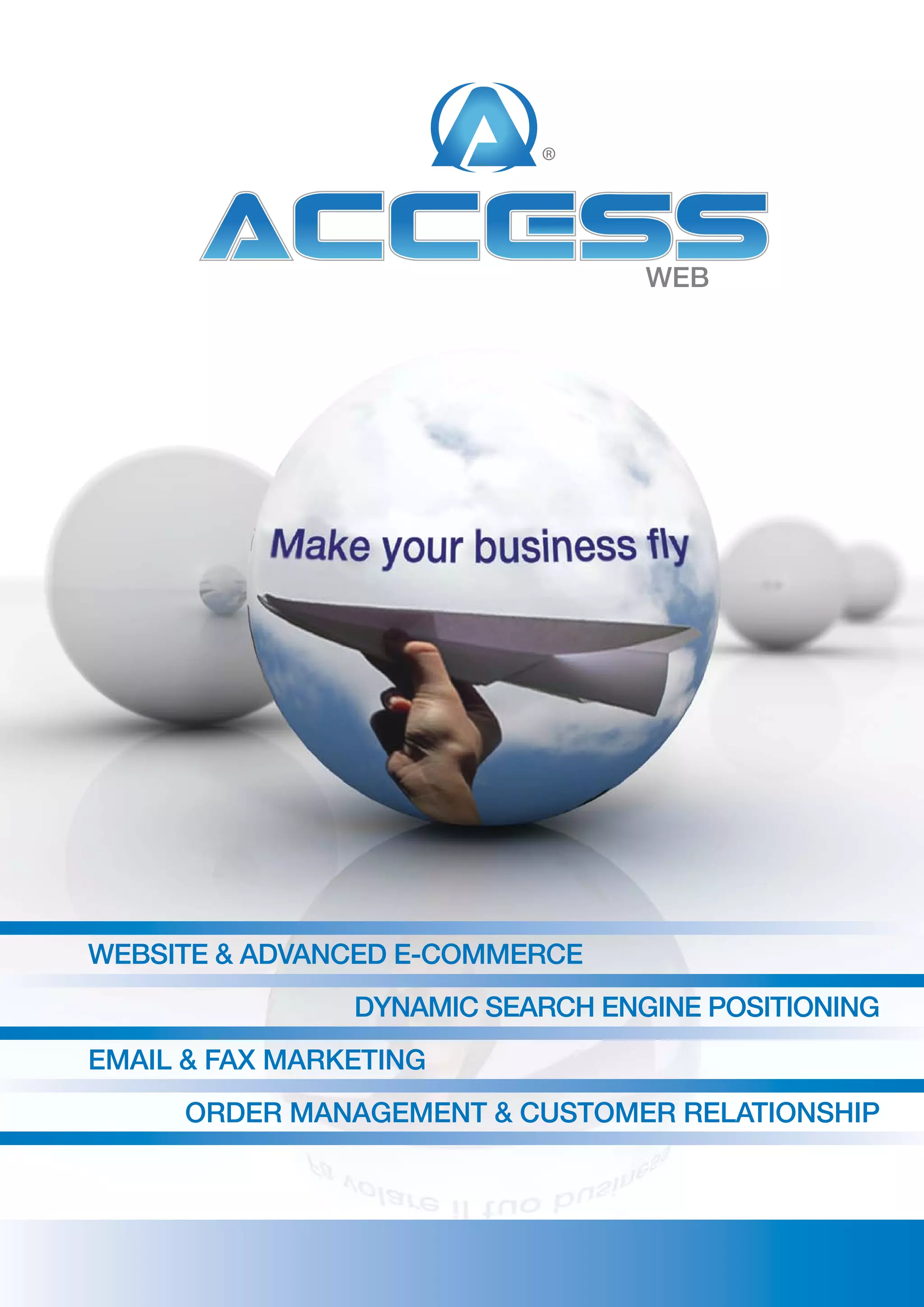 AccessWeb is a suite of internet applications that allows companies to create and manage websites and online stores, promote products through search engine optimization and email/fax marketing, and automate order management and customer relationships. The suite includes Access Public Relations for websites and e-commerce, Access Pole Position for dynamic search engine positioning, Access Promotion for email/fax marketing, and Access Order Manager for order management. AccessWeb aims to improve businesses by bringing potential customers to websites and facilitating online sales. It is an all-in-one solution for companies to sell products and services online.