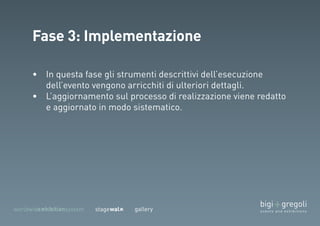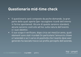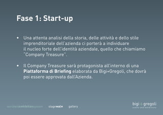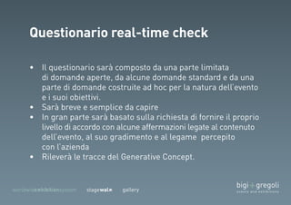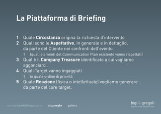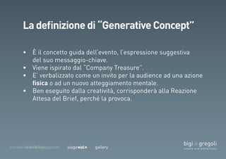 Il documento descrive un evento organizzato da un team di professionisti con diverse competenze e include partecipanti di diverse aziende. Si discute di temi relativi al company/brand treasure e delle strategie per la diagnosi delle esigenze e la raccolta dei risultati. Inoltre, vengono evidenziati concetti generativi e decisioni future nell'ambito del progetto.