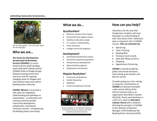 The Center for Development, Acculturation & Resolution Services (CEDARS) is a nonprofit organization that provides services to help refugees and international newcomers in Bowling Green, Kentucky adjust to their new community. CEDARS offers classes on American cultural norms, healthcare, driving, and more. It also provides programs focused on sustainable development, education, entrepreneurship, and employment. CEDARS works to resolve disputes in the community through an ombudsman and conflict resolution services. Volunteers are needed to assist with mentoring, teaching, transportation, and other services to support CEDARS' mission of helping newcomers adapt and become self-sustaining.