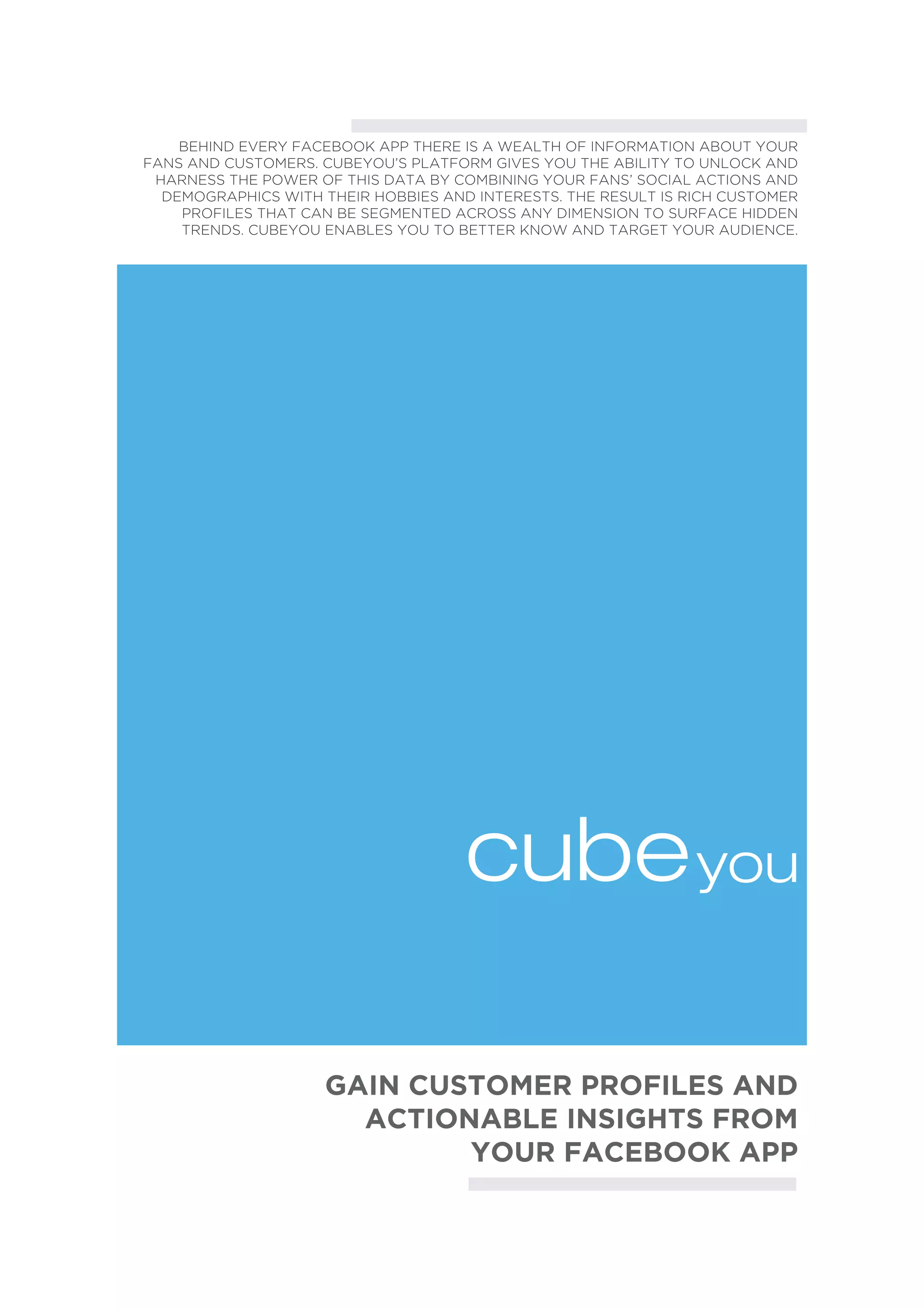 This document describes Cubeyou, a customer analytics platform. It provides examples of how Cubeyou helps companies analyze customer data from social media to better understand customers, target communications, and measure marketing campaign effectiveness. Specifically, it shows how Cubeyou helped Vodafone, Cosmopolitan magazine, and Amadori food company customize their messaging, improve customer retention, and calculate return on investment from various marketing activities.
