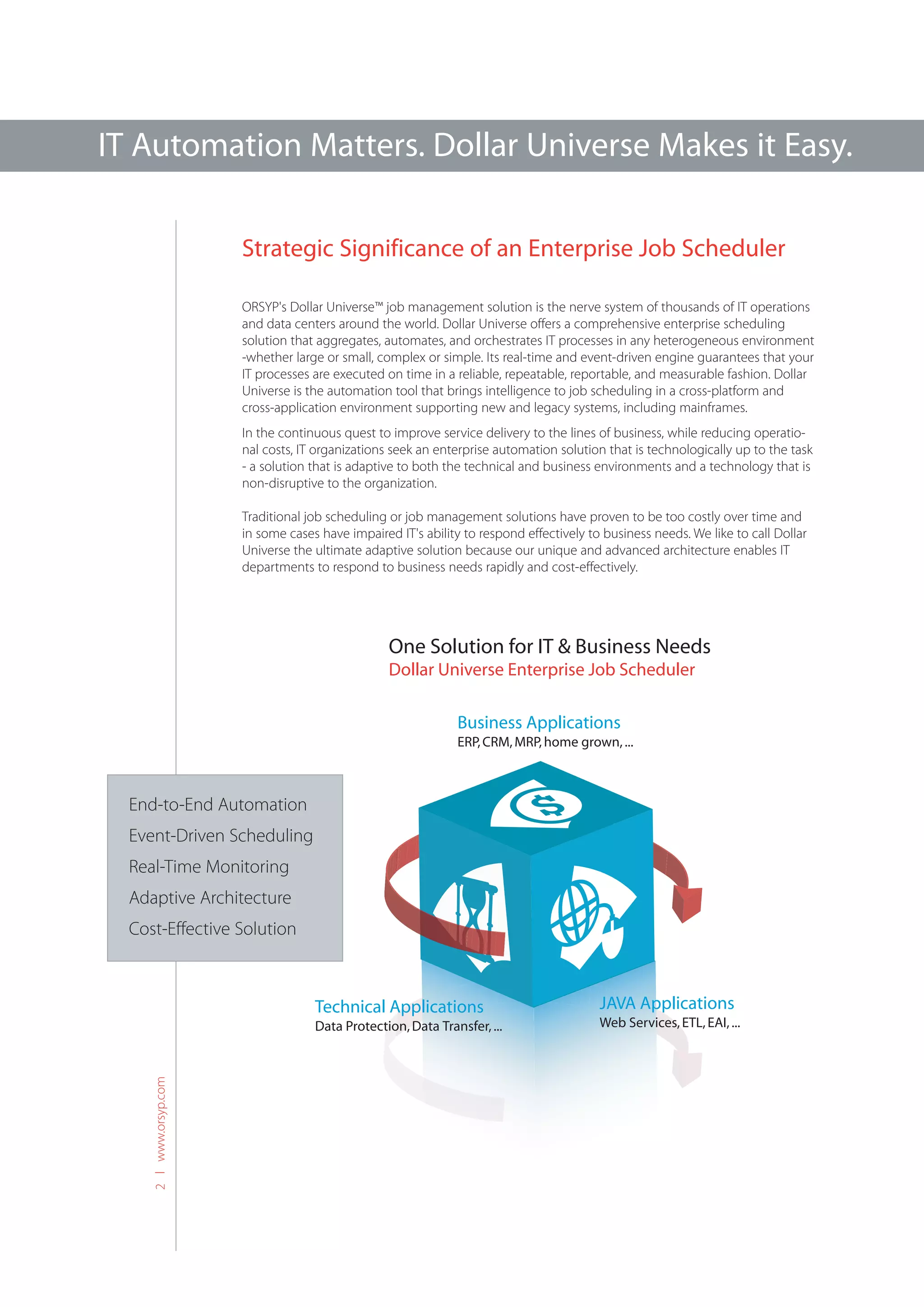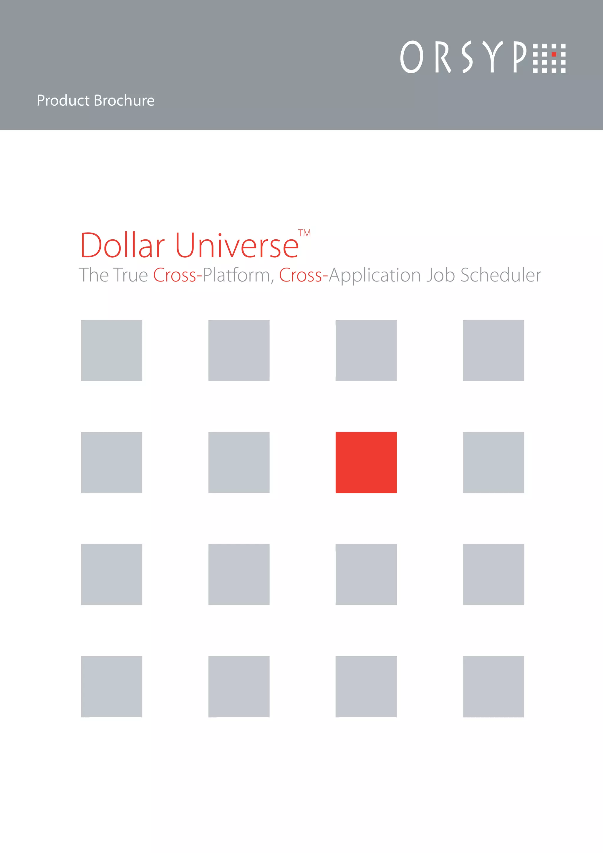 The document is a product brochure for Dollar Universe, a job scheduling solution from ORSYP. It summarizes Dollar Universe as a comprehensive enterprise job scheduling solution that can automate and orchestrate IT processes across heterogeneous environments. It highlights features like real-time monitoring, event-driven scheduling, and an adaptive architecture. The brochure also describes benefits like increased productivity, enhanced agility, reduced costs, and lower operational risks through reliable fault-tolerant scheduling.