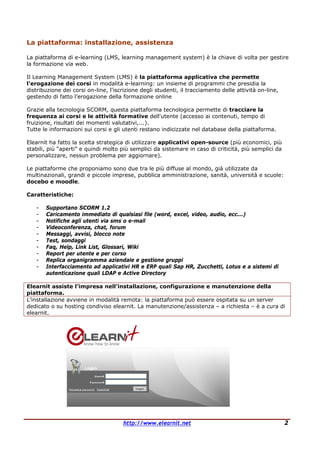 Il documento presenta elearnit, una piattaforma di formazione online che offre soluzioni di e-learning integrate e personalizzabili per aziende, utilizzando software open source per ridurre costi e ottimizzare risorse. Elearnit fornisce un sistema LMS (Learning Management System) per gestire corsi online, supportando diverse esigenze aziendali attraverso corsi su misura e a catalogo, consulenze e formazione all'uso della piattaforma. La piattaforma consente anche l'integrazione con software aziendali esistenti e fornisce supporto tecnico e assistenza personalizzata.