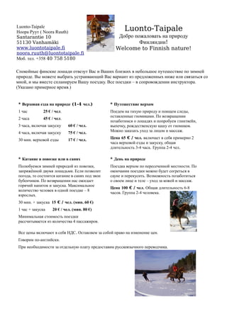 Луонто-тайпале предлагает различные зимние приключения на природе в Финляндии, включая верховую езду и поездки на повозках. Услуги включают экскурсии с инструкторами и возможность заказать различные закуски и уход за собой. Цены варьируются в зависимости от выбранного пакета, а также предоставляются услуги русского переводчика по запросу.