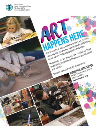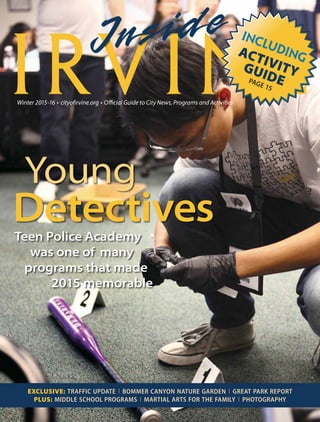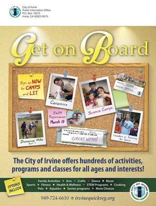 This document is a brochure for recreation programs and activities in Irvine for Spring 2016. It provides information on various city programs for teens, children, adults, seniors and families. It also highlights the completion of the Bommer Canyon Nature Garden and previews upcoming events and developments in the city for 2016.