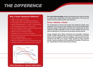 Keiser equipment uses pneumatic resistance instead of weight stacks to allow training at any speed with little impact. This includes Keiser Racks, which combine pneumatic and weight plate resistance to emphasize strength, speed, and stability training. The Infinity Series features cable machines that adjust resistance in small increments for precise workouts. Accessories like straps, bars, and benches add versatility.