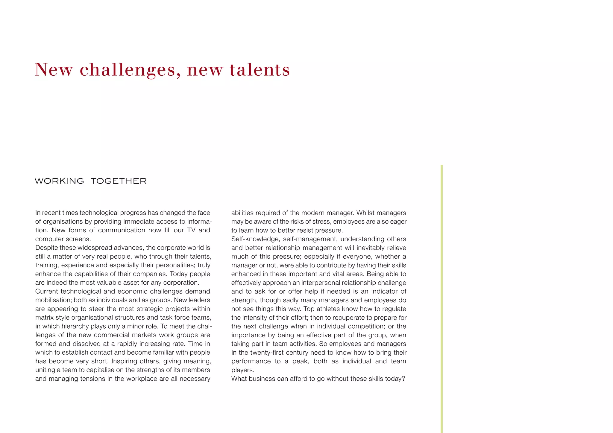 The document discusses the impact of technological advancements on corporate communication and emphasizes the importance of interpersonal relationships and teamwork within organizations. It introduces the Process Communication Model (PCM) developed by Dr. Taibi Kahler, highlighting its effectiveness in enhancing communication, stress management, and leadership in matrix-style organizational structures. PCM offers tools for understanding personality dynamics, facilitating better team collaboration and individual performance, thereby optimizing workplace interactions and reducing stress.