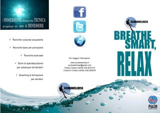 Il documento descrive il programma 'Scuba Wellness', che unisce attività subacquea e tecniche di autocontrollo per migliorare il benessere psicofisico degli individui. Offre corsi di specializzazione per subacquei e istruttori, focalizzandosi su tecniche corporee acquatiche e pratiche di meditazione. I programmi sono progettati per ridurre lo stress, migliorare la padronanza sugli istinti e promuovere una comunicazione bidirezionale tra mente e corpo.