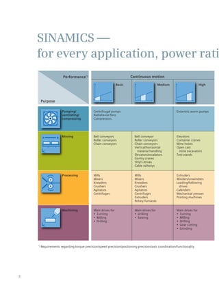This document discusses drive solutions from Siemens for various industrial applications. It describes the SINAMICS drive family which provides integrated solutions for pumping, ventilation, compression, processing, material handling, and motion control applications. The drives range in power from 0.12 kW to 120 MW and can be used with pumps, fans, compressors, conveyors, cranes, presses and other machinery.