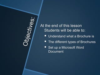 The document discusses different types of brochures, including bi-fold and tri-fold brochures. Bi-fold brochures have four panels formed from a double print folded in half, while tri-fold brochures are thinner and have six panels from being folded into three sections. Brochures are commonly found in places like museums, shops, and information booths where they are used as marketing and informational tools. It is important to plan the layout of a brochure to grab readers' attention, with the cover typically including the name and photo and the inside using headings, short sentences, and proper grammar.