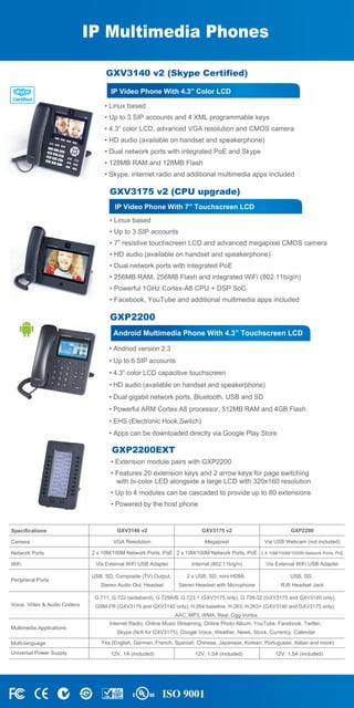 The document provides information on various VoIP products including IP phones, video phones, IP PBX appliances, analog telephone adapters, and analog VoIP gateways. Key products highlighted include the GXV3140 and GXV3175 IP video phones, GXP2200 Android multimedia phone, UCM6102/6104 and UCM6108/6116 IP PBX appliances for small and medium businesses, and HT502/HT503 analog telephone adapters. Specifications such as features, interfaces, codecs, and certifications are listed for each product line.