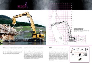 2) Rusch Special Products designs custom demolition machines based on excavators, including the Triple with booms reaching 34 meters and carrying tools up to 25 tons, built on modified 80-180 ton excavators using high strength 960 N/mm2 steel.