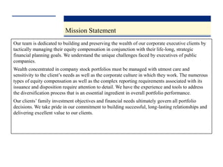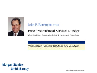 John Barringer is an Executive Financial Services Director and Vice President at Morgan Stanley Smith Barney who specializes in providing personalized financial solutions and wealth management services for corporate executives. His team focuses on tactically managing equity compensation for executives through strategic financial planning and portfolio diversification. They take a client-centered approach using a five-step process to help clients meet their financial goals through asset allocation and customized investment strategies.