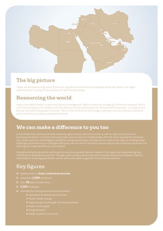 Veolia is a global leader in optimized resource management providing innovative environmental solutions in waste, energy, water, and other areas. It has over 3,300 employees in the Middle East with over 30 years of experience working across sectors like operations and maintenance, water technologies, engineering, and more. Veolia aims to address pressing environmental challenges through resource management, innovative solutions, and public-private partnerships.