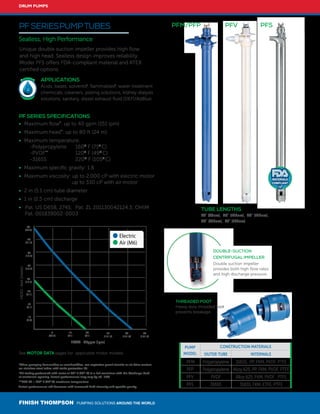 This document provides specifications for various drum and barrel pumps from Finish Thompson. It includes information on multiple pump series that are suitable for different applications based on factors like flow rate, head pressure, viscosity, and temperature requirements. Some key pump series summarized include: