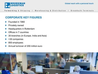Broekman Logistics is a privately owned logistics company founded in 1960 with headquarters in Rotterdam and offices in 7 countries. It has over 800 employees, annual turnover of 200 million euro, and provides customized logistics solutions through its services in forwarding, shipping, warehousing and distribution, breakbulk terminals, offshore and heavy lift, and project cargo.