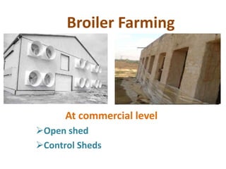 This document provides information on broiler farming practices for open sheds and controlled sheds. It discusses the advantages and disadvantages of each system. Controlled sheds have higher construction and running costs but allow for more automated control of feeding, watering, temperature, and humidity. They result in higher weight gain and feed conversion rates. Open sheds have lower costs but require more manual labor and do not allow as much control, resulting in more variable production outcomes.