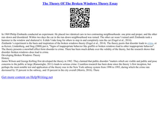 The Broken Windows Theory proposes that minor crimes and disorder, if left unchecked, can lead to more serious crimes. The theory was developed by James Q. Wilson and George Kelling in 1982. Critics argue that aggressive over-policing of minor offenses based on this theory strains the criminal justice system and burdens impoverished people, while supporters point to reductions in crime rates in areas where it was applied, such as New York City in the 1990s. Debate continues around the theory's validity and impact.