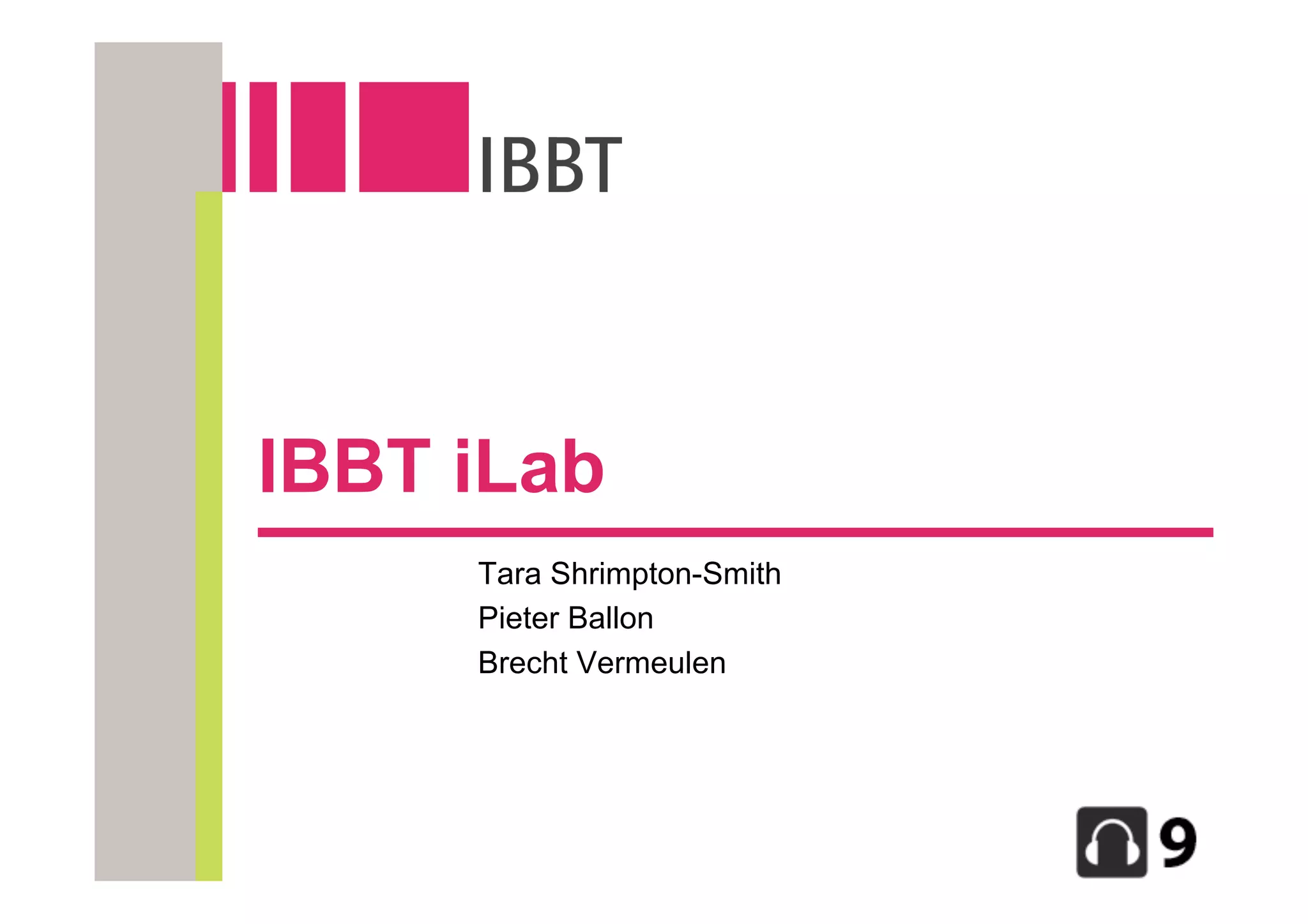 The document describes the structure and facilities of the IBBT iLab, which includes research groups, a technical test center for evaluating platforms and networking equipment, an open innovation center for multi-stakeholder collaboration on policy issues, and a usability lab for testing products and services. The technical test center is equipped to evaluate various networking technologies and conduct performance testing and analysis. The usability lab allows for usability testing in controlled laboratory environments or portable and mobile setups in natural contexts.