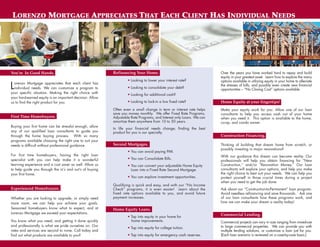 Lorenzo Mortgage is a collection of lending professionals with 20 years of combined experience. They aim to satisfy client needs by getting loans approved quickly and closing them with kindness. Lorenzo understands that each client has individual needs and works to align financing solutions with those needs. They offer a variety of loan products from over 50 lenders to find clients the best rates and terms. Lorenzo prides itself on building lifelong relationships with clients through excellent customer service and loan products.