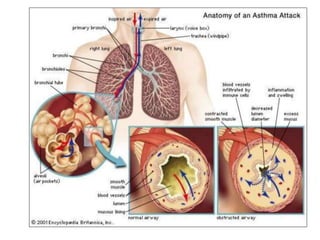 Bronchial asthma is a chronic inflammatory disease of the airways characterized by recurrent episodes of wheezing, breathlessness, chest tightness, and coughing. Key symptoms include coughing, especially at night, wheezing, and shortness of breath. Asthma affects over 300 million people worldwide and is caused by a combination of genetic and environmental factors. While there is no cure, asthma can be effectively controlled through medication like inhaled corticosteroids and bronchodilators, and by avoiding triggers.