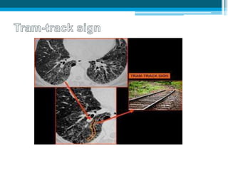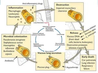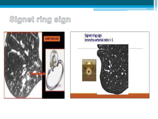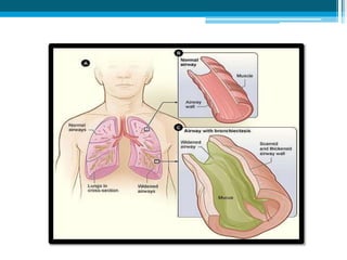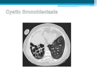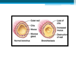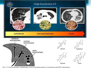 Bronchiectasis in children is an irreversible dilation of the airways caused by destructive changes to the airway walls. It has many causes including cystic fibrosis, infections, immunodeficiencies, and anatomical defects. The pathology involves a vicious cycle of impaired mucus clearance leading to recurrent infections, inflammation, and further airway damage. Symptoms include cough, sputum production, and breathing difficulties. Diagnosis is made through imaging like HRCT that shows changes to airway contours. Treatment focuses on airway clearance techniques and controlling infections with antibiotics. Management of underlying conditions and lung transplantation may be needed in severe cases.