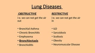 Bronchiectasis is an obstructive lung disease characterized by irreversible dilation and destruction of bronchial walls, primarily caused by chronic inflammation and infections. It can be classified into cylindrical, varicose, and saccular forms, with common causes including congenital conditions like cystic fibrosis and acquired conditions such as tuberculosis. Diagnosis involves a combination of patient history, sputum analysis, radiological examinations, and pulmonary function tests, while management may include antibiotics and surgery.