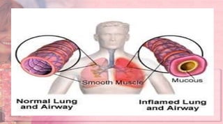 Bronchitis is inflammation of the bronchi. It can be acute or chronic. Acute bronchitis often occurs with a cold or flu and is characterized by cough with mucus. Chronic bronchitis lasts more than 3 months per year for over 2 years and is usually caused by smoking or air pollution. Symptoms include productive cough. Treatment involves antibiotics for bacterial infections, bronchodilators to open airways, mucolytics to thin mucus, steroids to reduce inflammation, and pulmonary rehabilitation. Nursing care focuses on breathing treatments, pulmonary hygiene, comfort measures, and health education. Preventing bronchitis involves avoiding tobacco smoke, managing diet, hand washing, and using a humidifier.