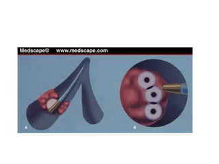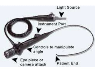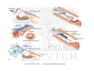 Bronchoscopy is a technique used to visualize the airways for diagnostic and therapeutic purposes. The history began in 1897 with rigid bronchoscopes, but flexible fiberoptic bronchoscopes were invented in 1966, allowing better visualization. Flexible bronchoscopy has now largely replaced rigid bronchoscopy. Bronchoscopy is used for diagnostic and therapeutic procedures like biopsy, foreign body removal, laser therapy, photodynamic therapy, brachytherapy, cryotherapy, and airway stenting.